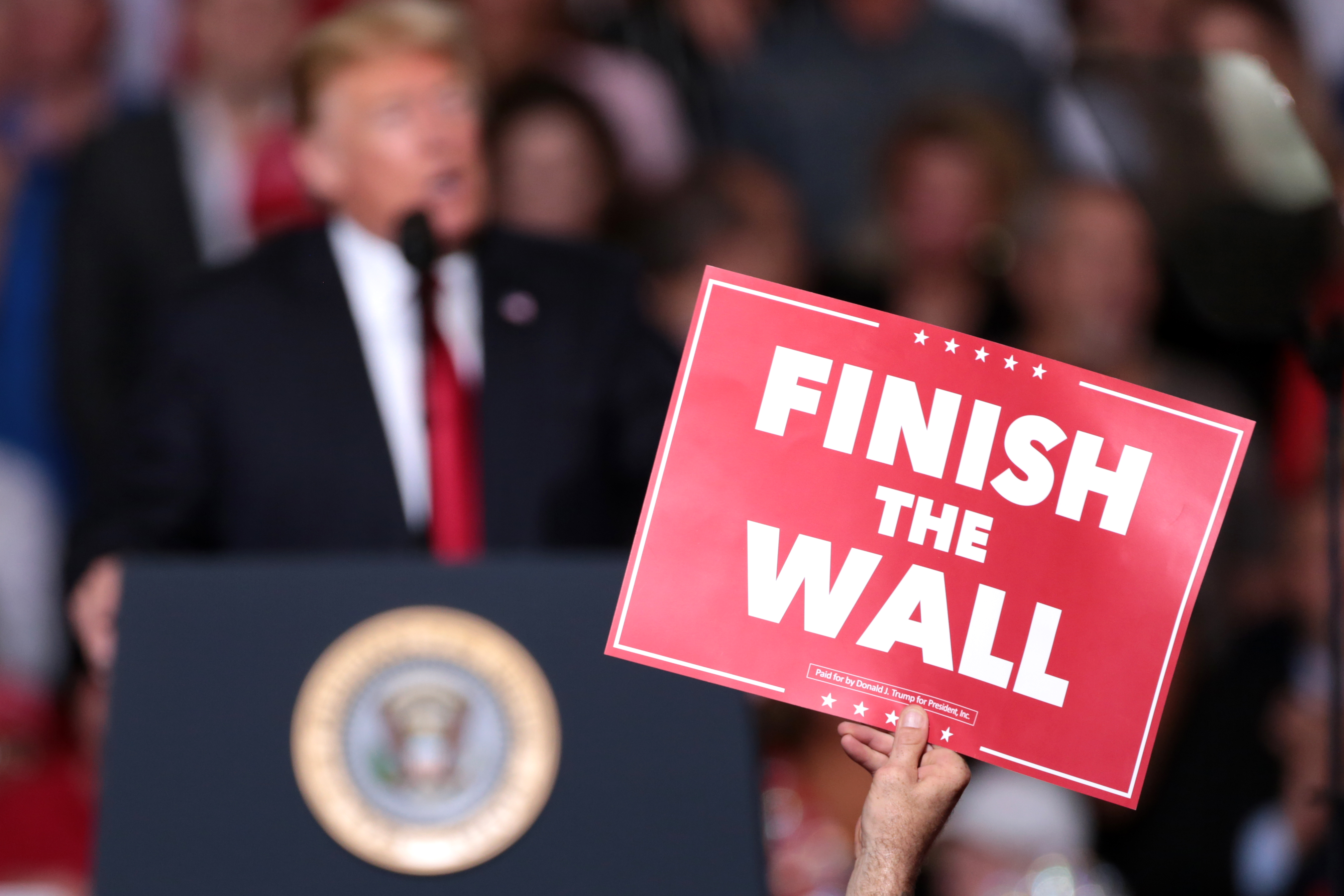 Finish the Wall sign at a Make America Great Again campaign rally for President of the United States Donald Trump at International Air Response Hangar at Phoenix-Mesa Gateway Airport in Mesa, Arizona.