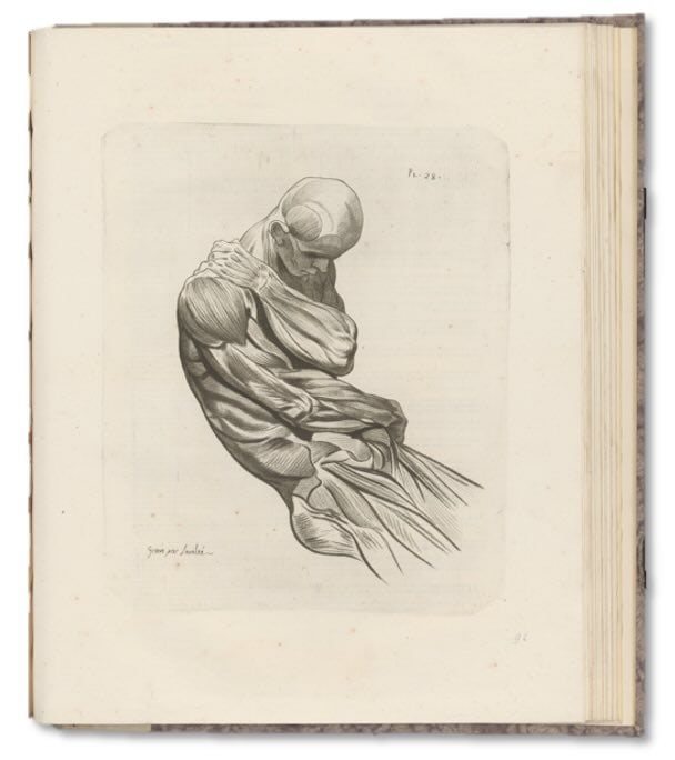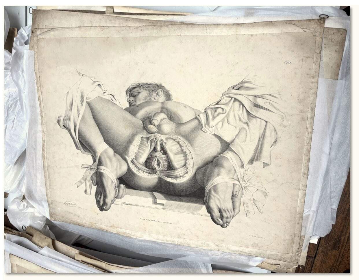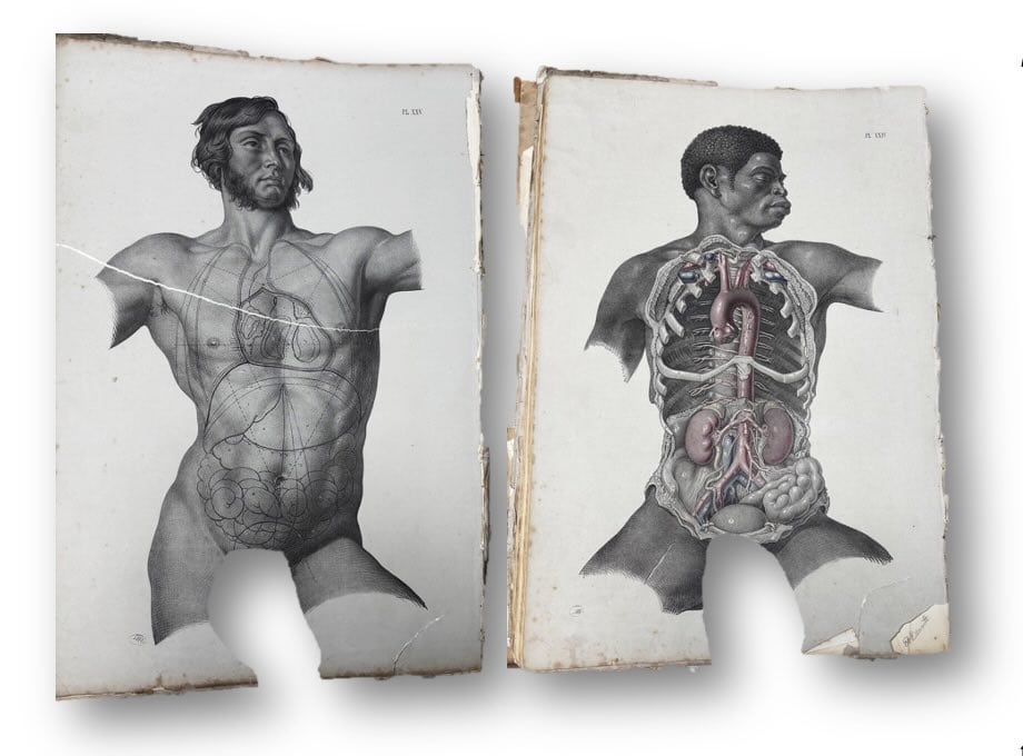 In the era of free-floating digital media, we customarily detach images from their material and social context, and then manipulate and repurpose them. So in Queer Anatomies, where possible, I tried to show the edges of the page and books open to a page, to remind readers that anatomical illustrations lived on paper, in books and folios which were material objects, which in turn lived in library collections, alongside objets d’art and other collectibles. Rare and expensive anatomical atlases were often the prized possessions of bibliophilic collectors. If anatomized nudes and body-parts were fetishized objects of desire, so were the books and prints in which they appeared. There was a double frisson, double desire.